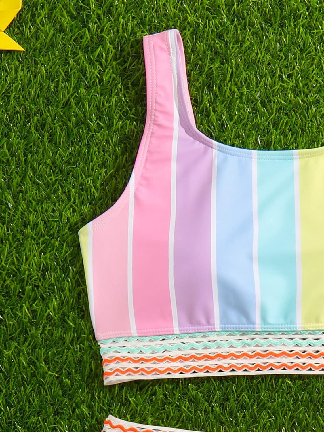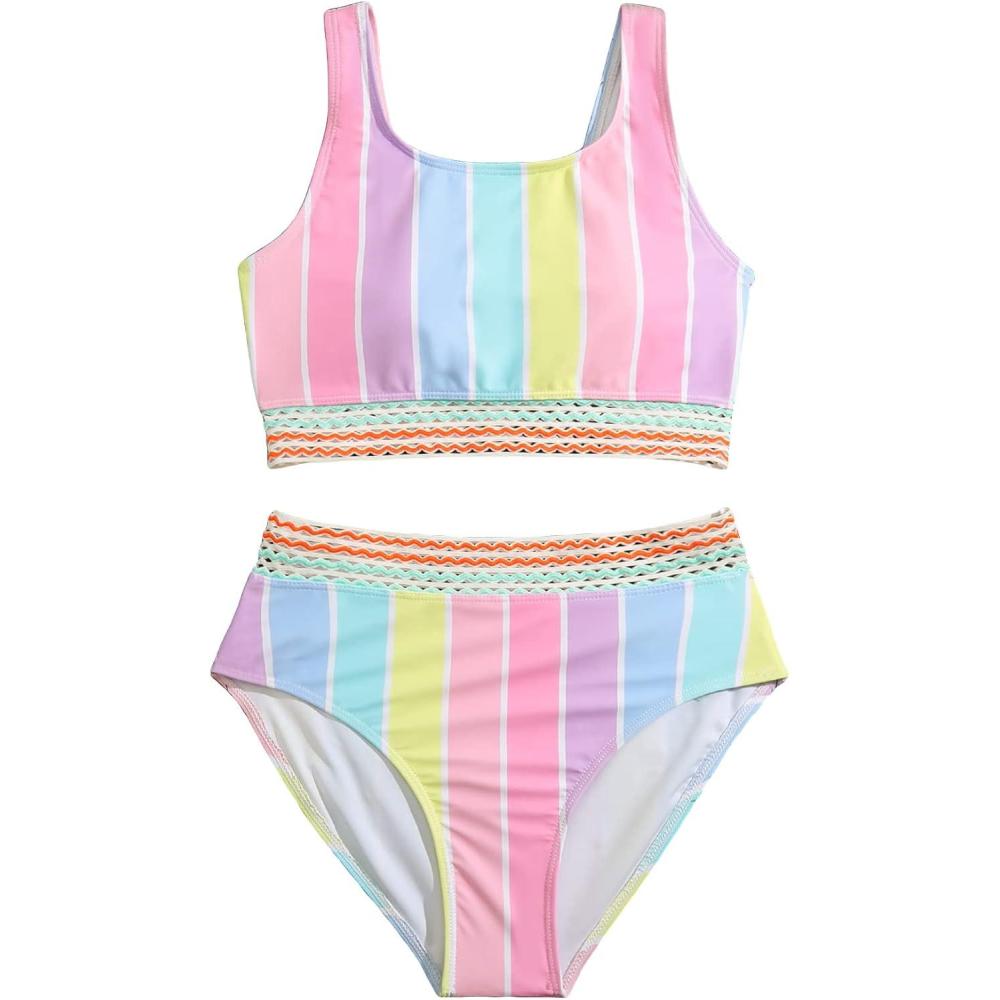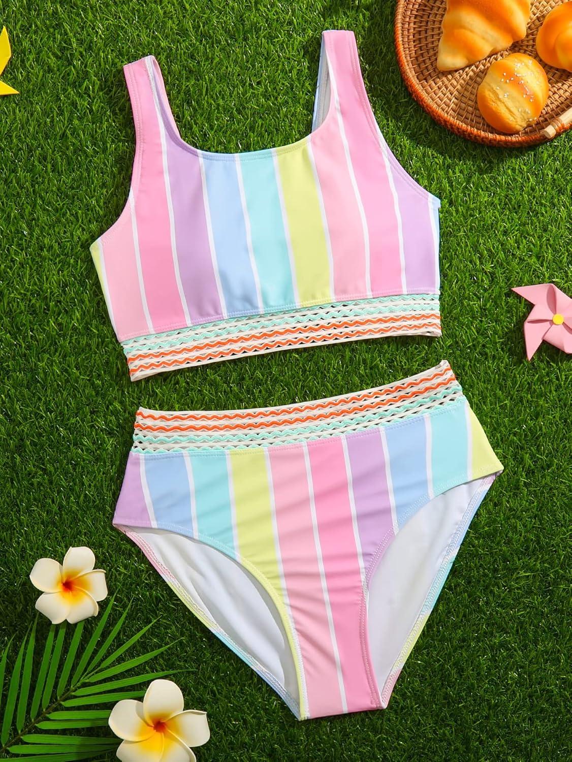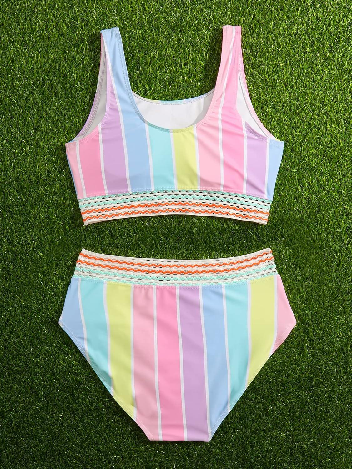 Milumia Girl 2 Piece Striped Bikini Swimsuit Contrast Mesh Scoop Neck Bathing Suit(Pink Blue)