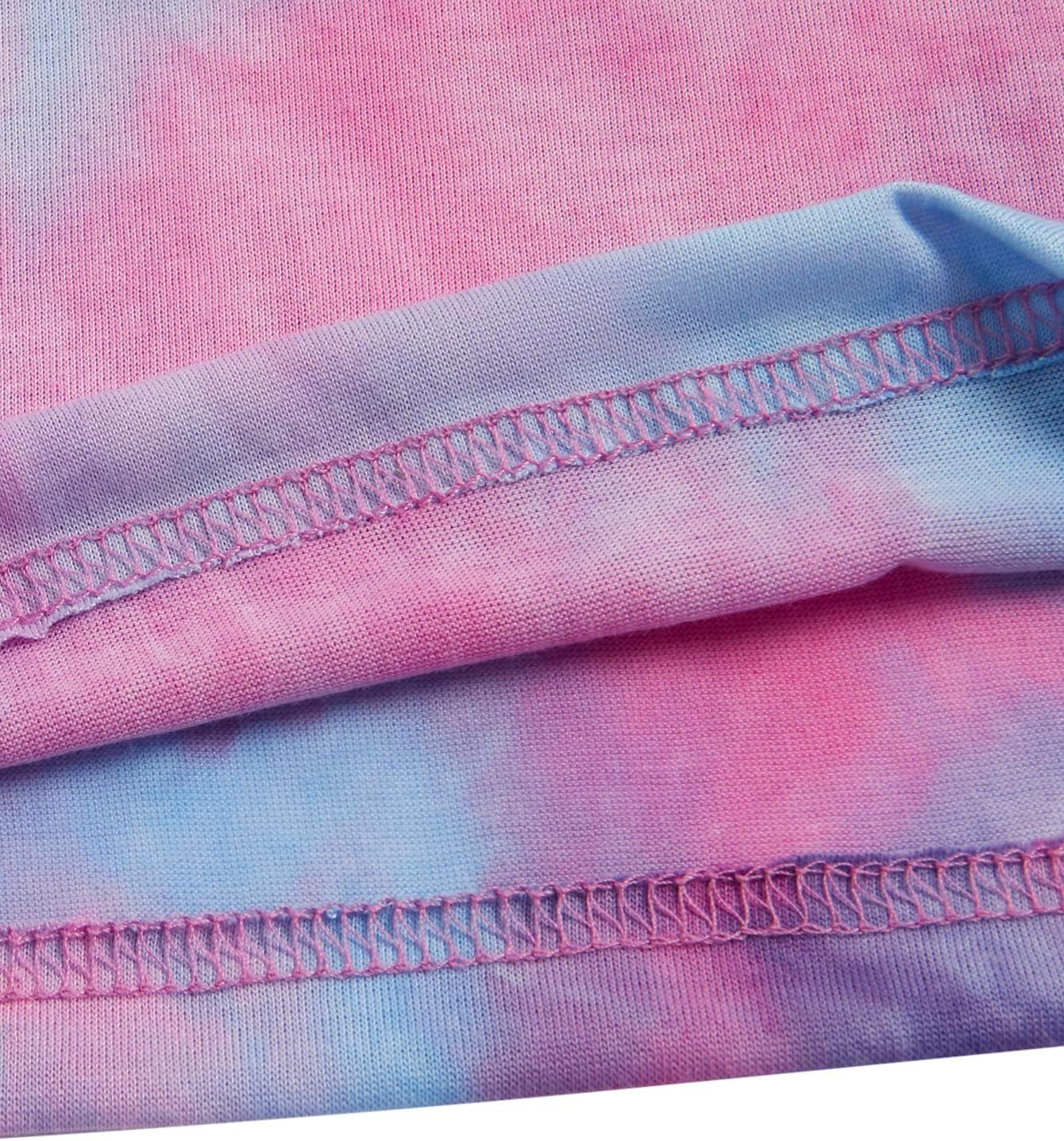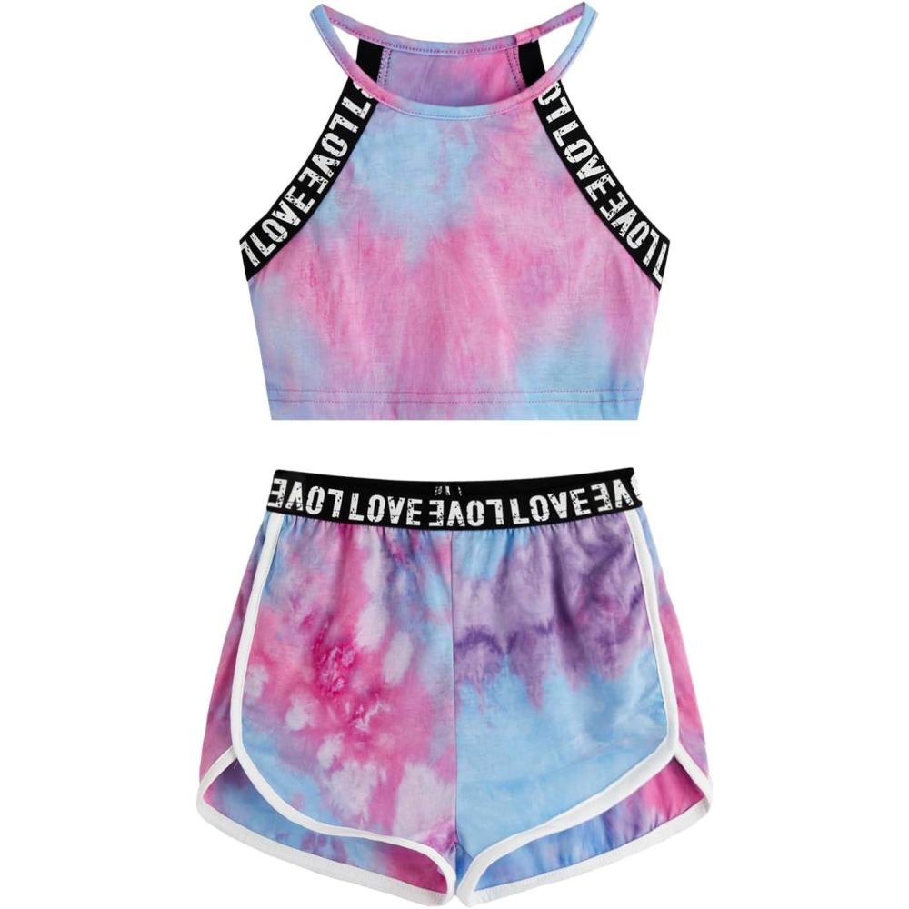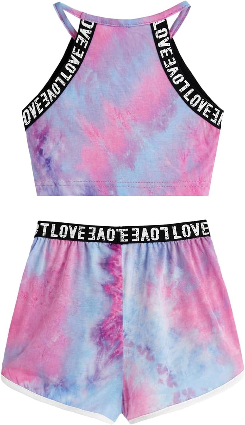 Milumia Girl’s 2PCS Outfit Tie Dye Letter Halter Cami Crop Top and Dolphin Shorts Set(Blue and Pink)