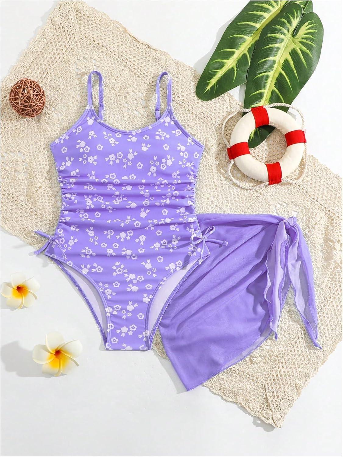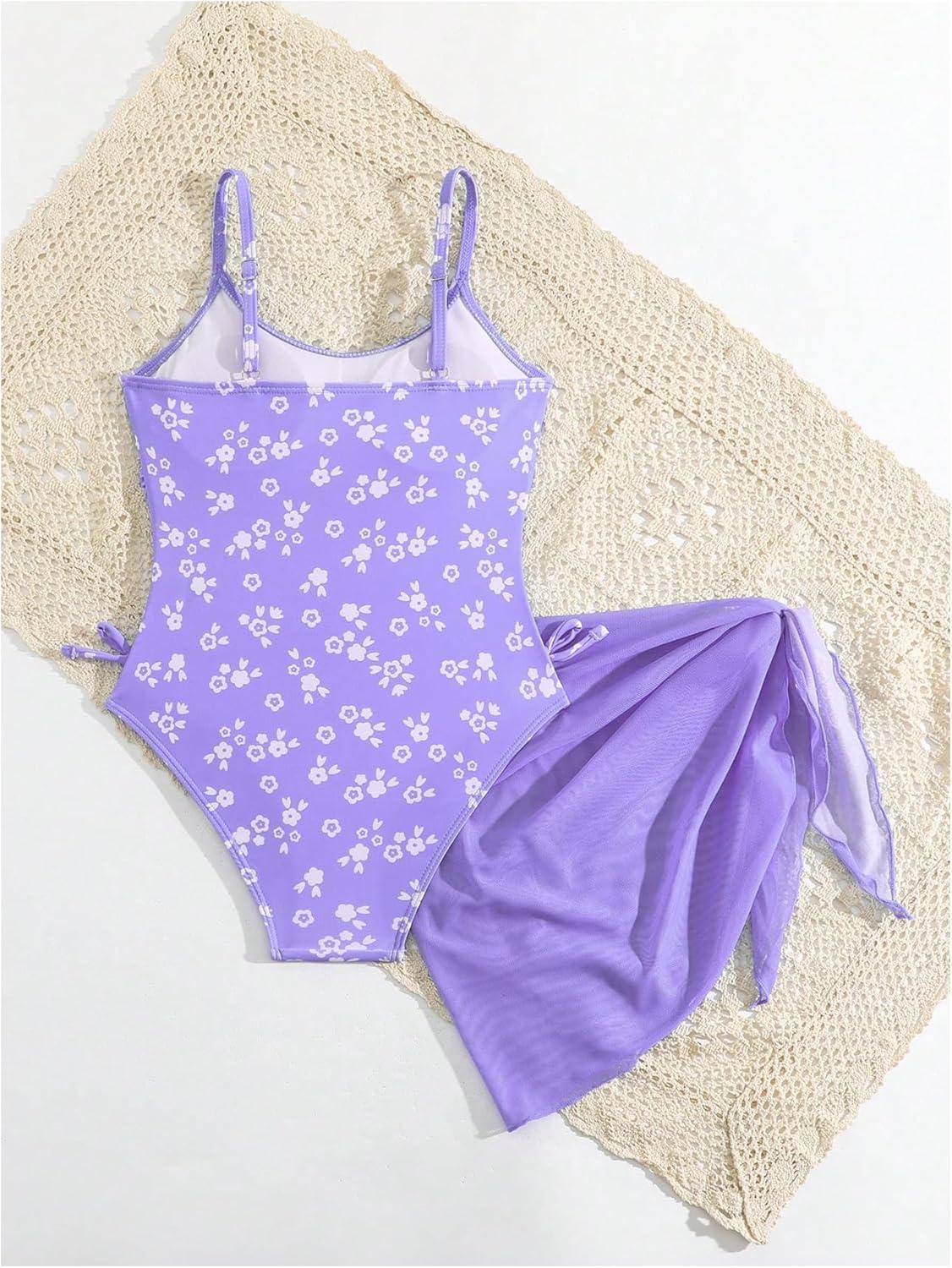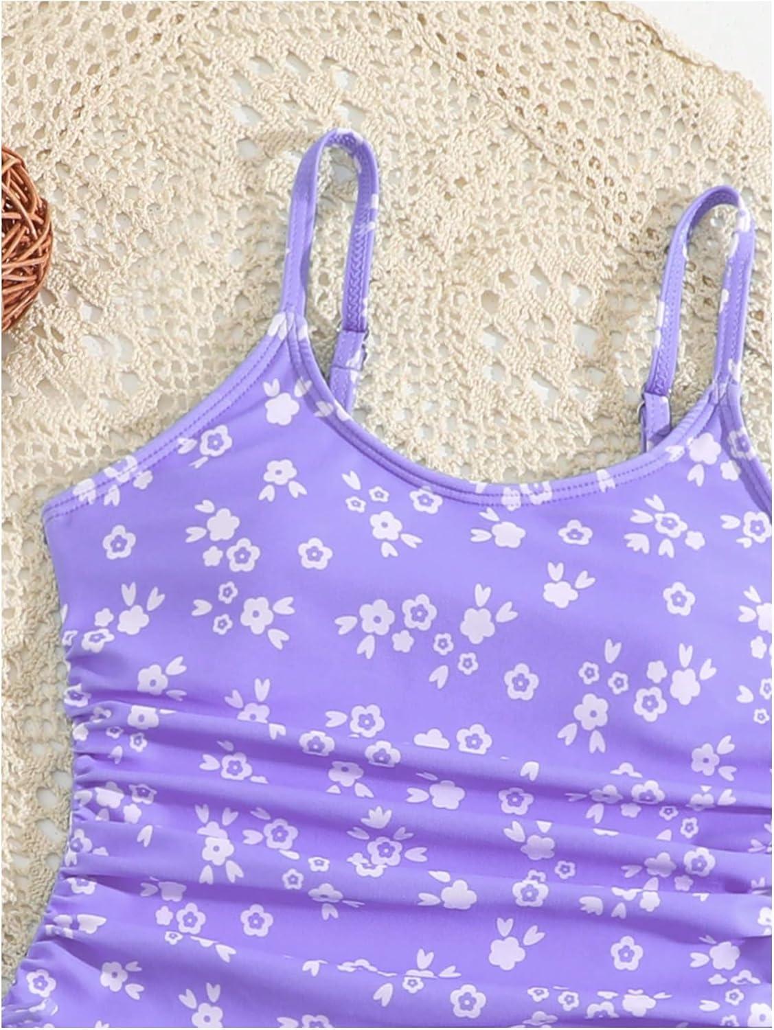 Milumia Girl's Ditsy Floral One Piece Swimsuit Ruched Spaghetti Strap Bathing Suit with Coverup Skirt(Purple)