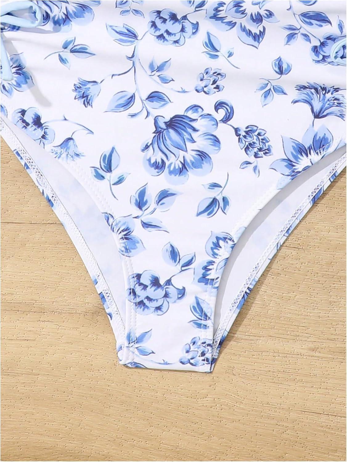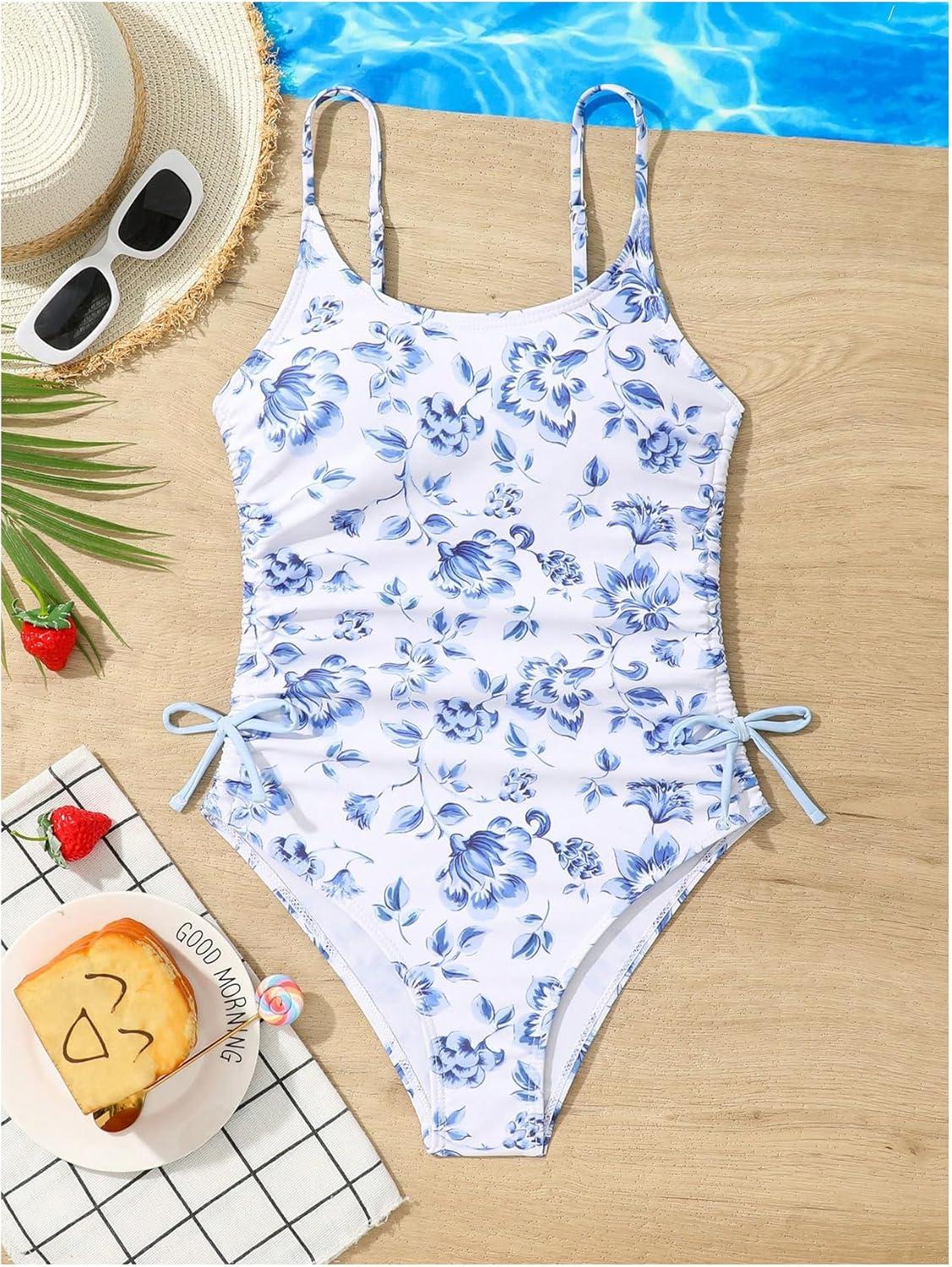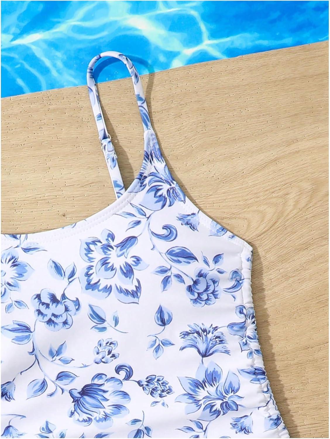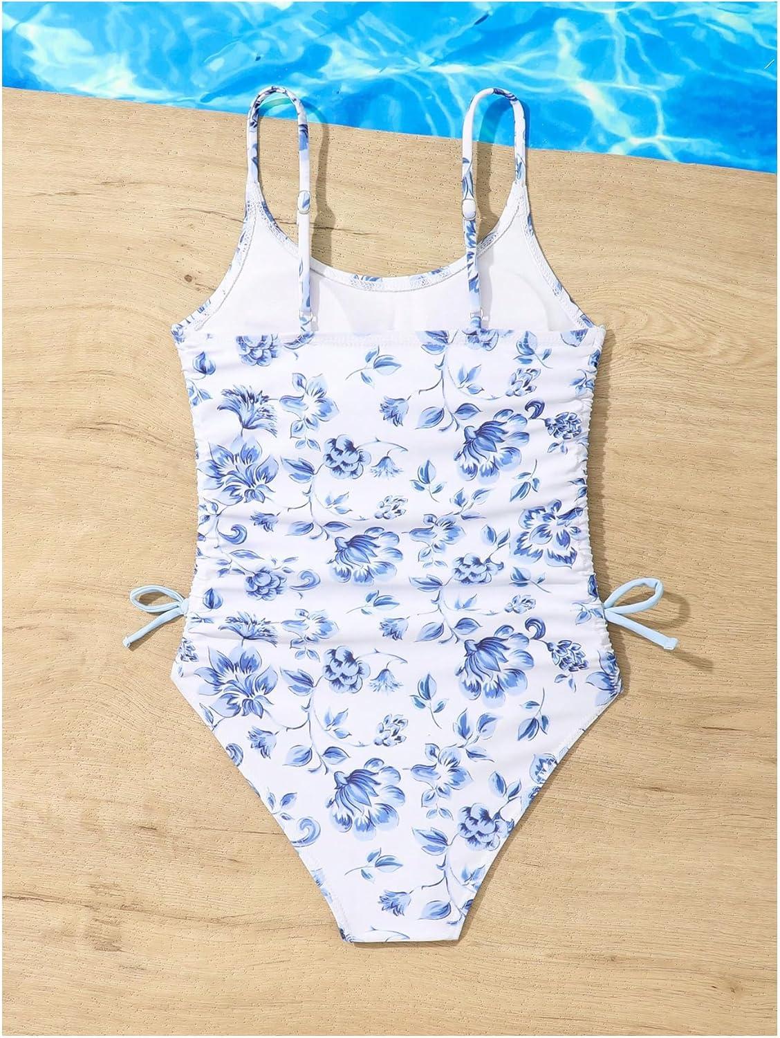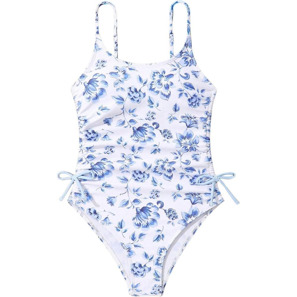 Milumia Girl’s Floral One Piece Swimwear Bow Tie Side Spaghetti Strap Swimsuits(Blue and White)