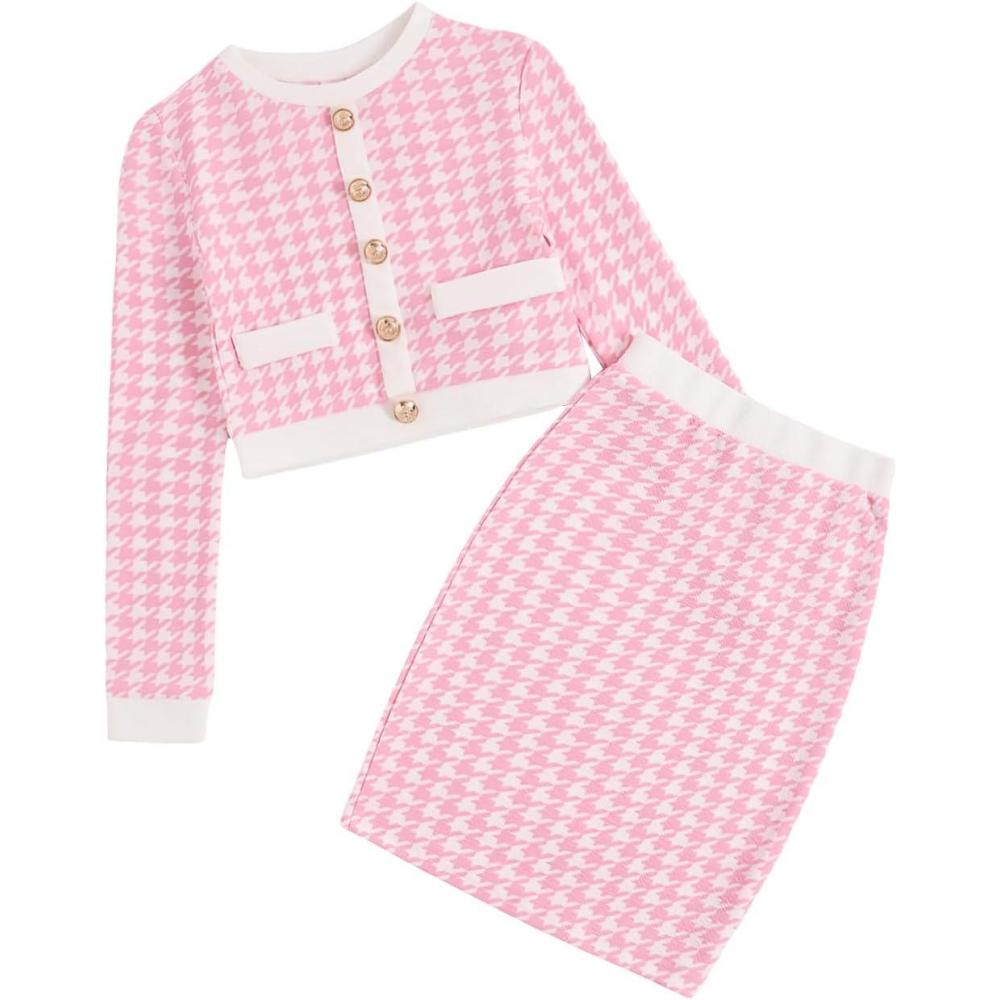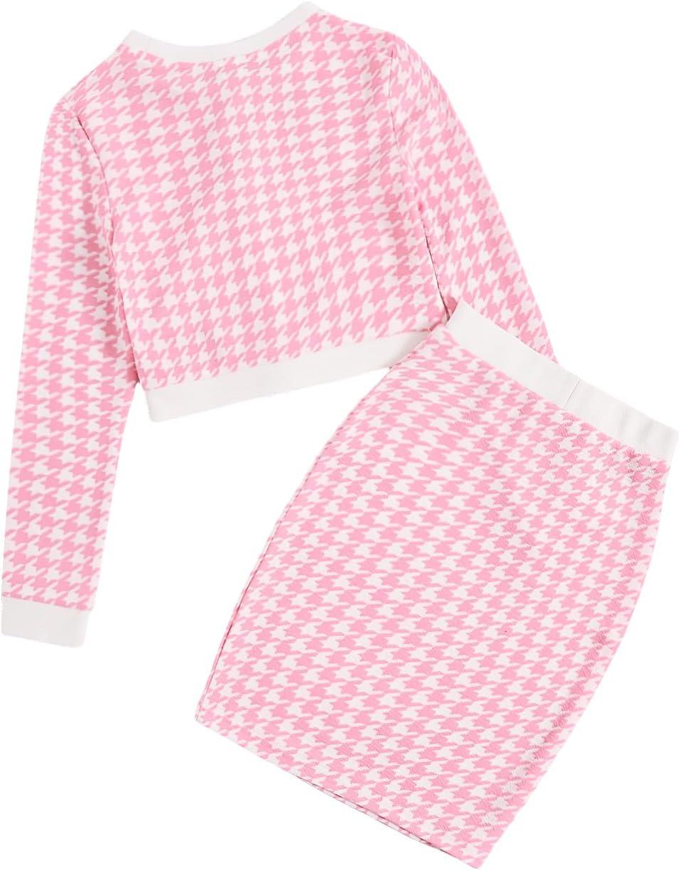 Milumia Girl's Two Piece Outfits Houndstooth Button Decor Crop Blazer Jacket and Skirt Sets(Pink)