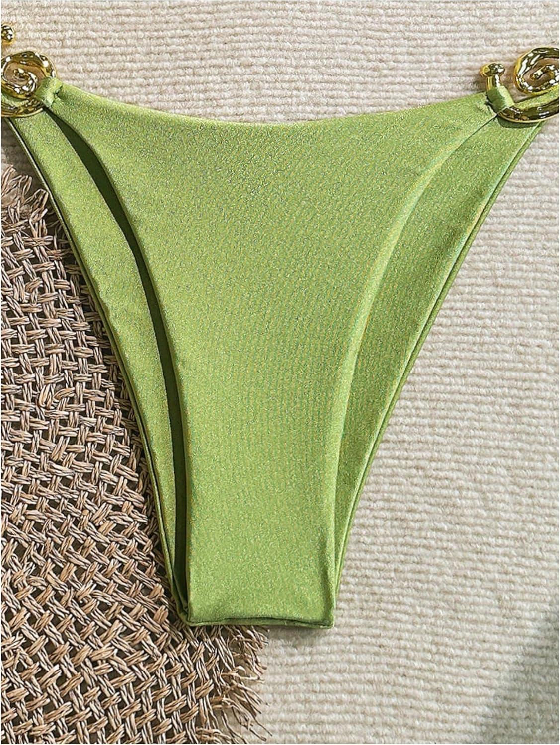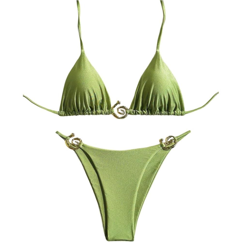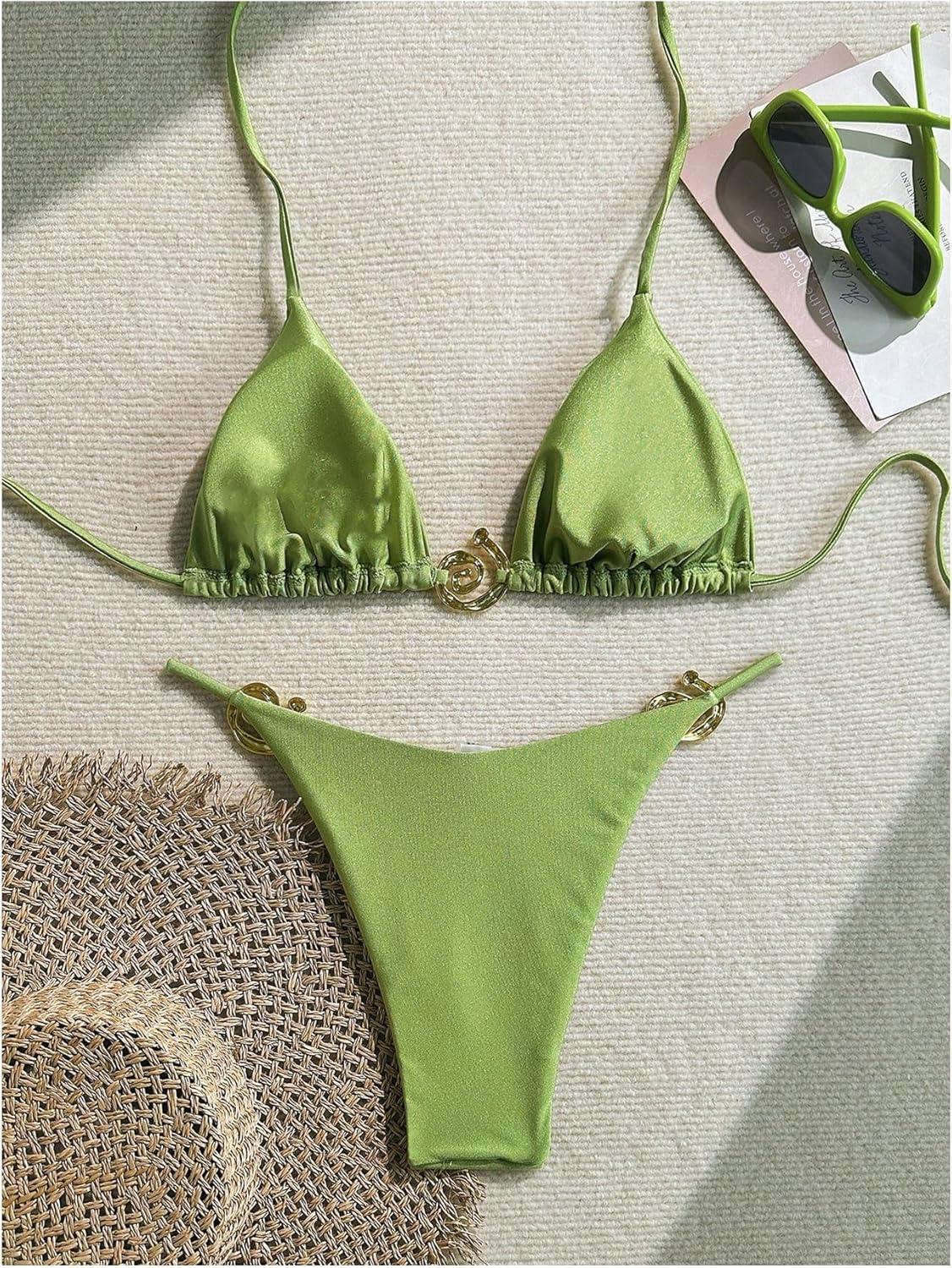 Milumia Women’s 2 Piece Halter Tie Back Cheeky Swimsuit Metal Decor Triangle Thong Bikini Set(Green)