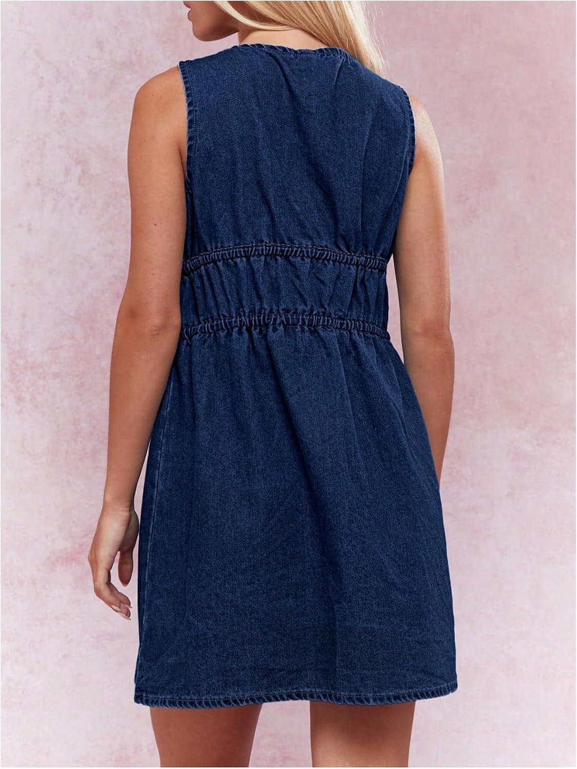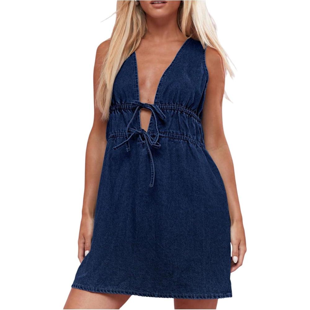 Milumia Women’s Bow Tie Plunge V Neck Sleeveless Straight Denim Short Dresses(Dark Blue)