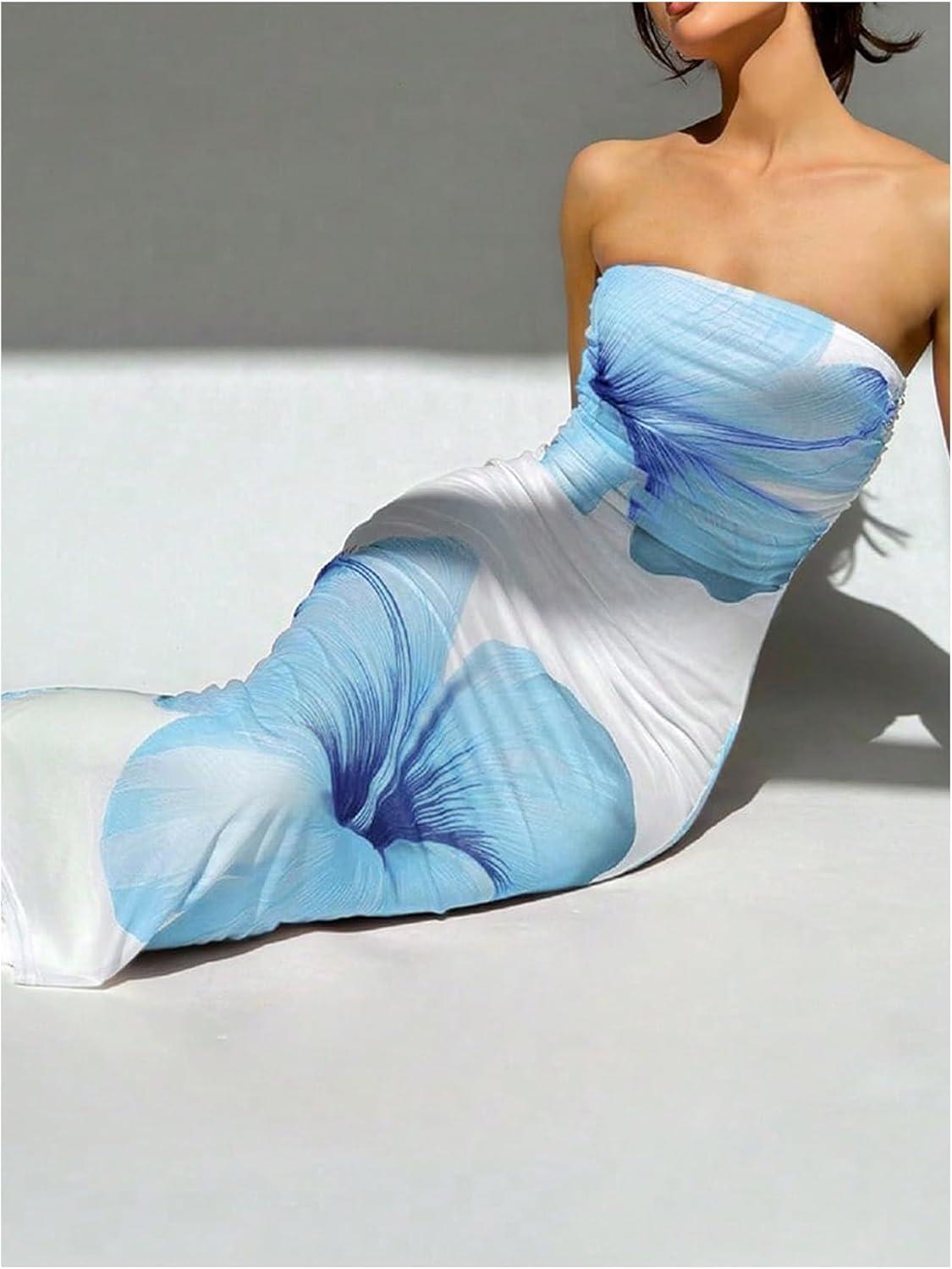 Milumia Women’s Floral Strapless Bodycon Maxi Dress Summer Tube Top Dresses(Blue and White)