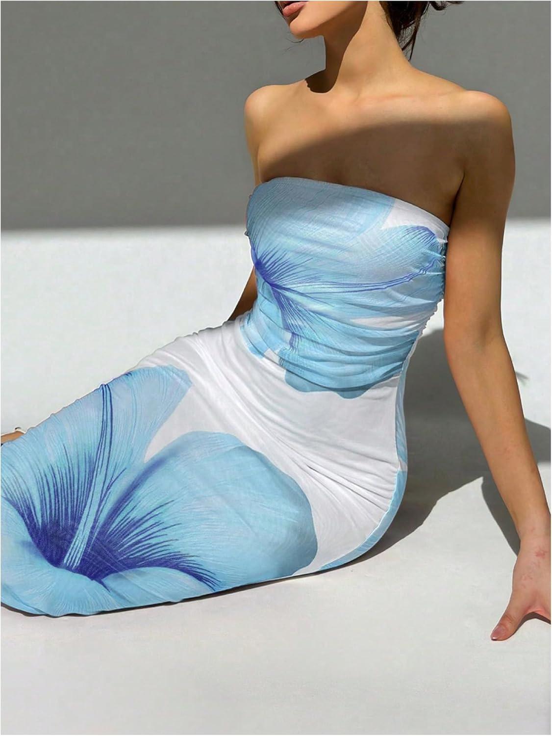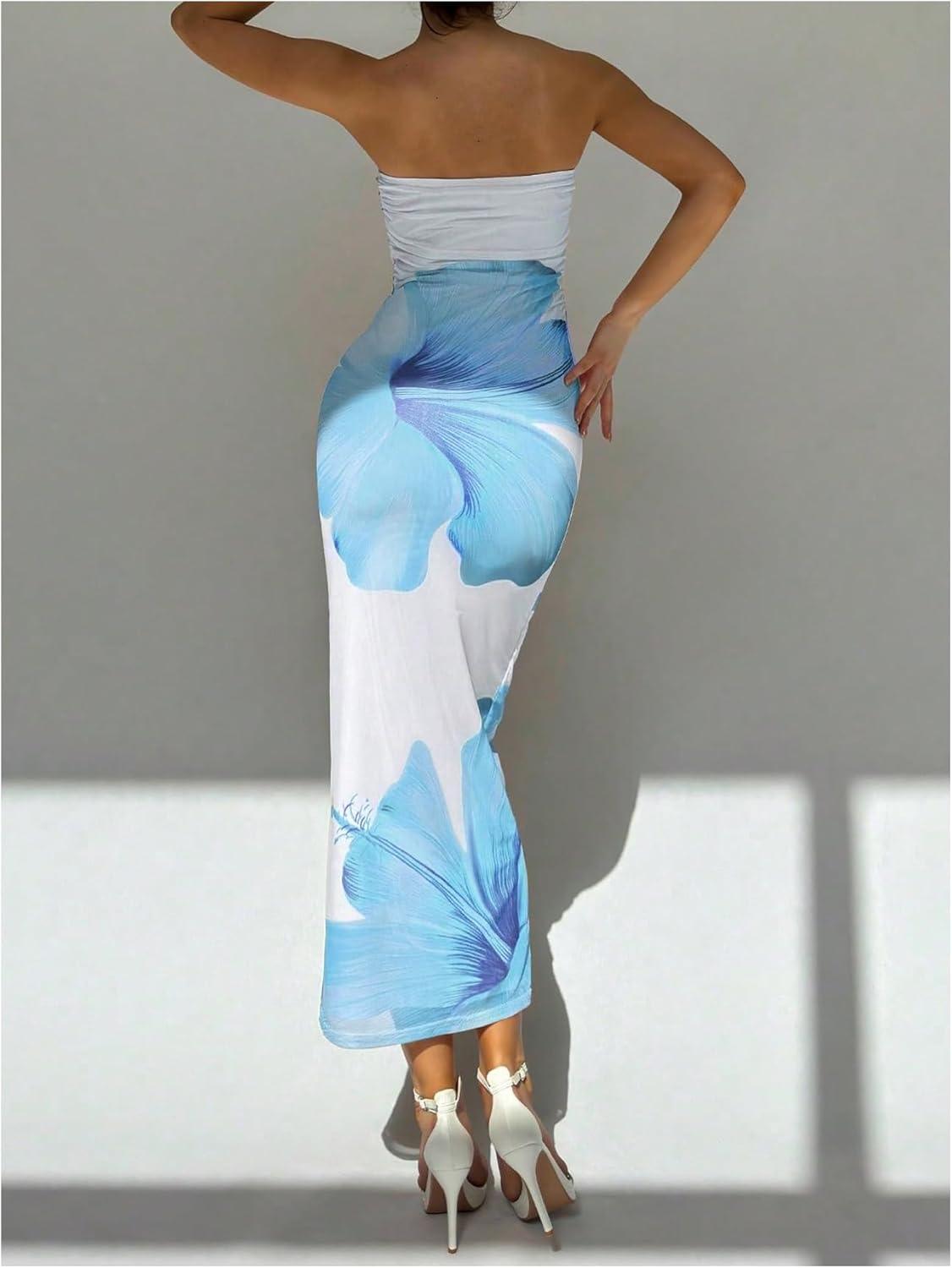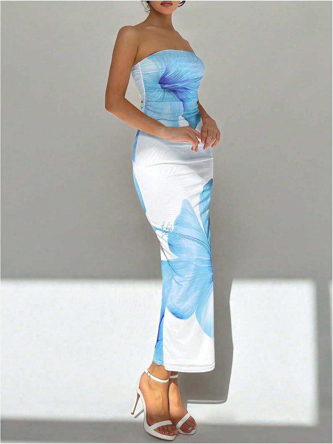 imageMilumia Womens Floral Strapless Bodycon Maxi Dress Summer Tube Top DressesBlue and White