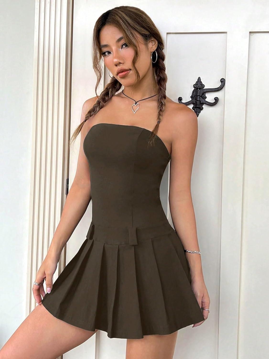 imageMilumia Womens Pleated Mini Tube Top Dress Sleeveless A Line Bandeau Short DressesCoffee Brown