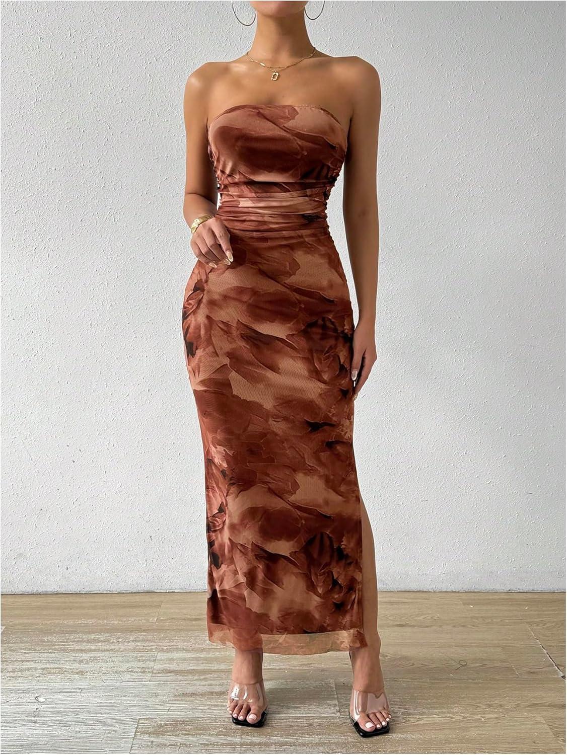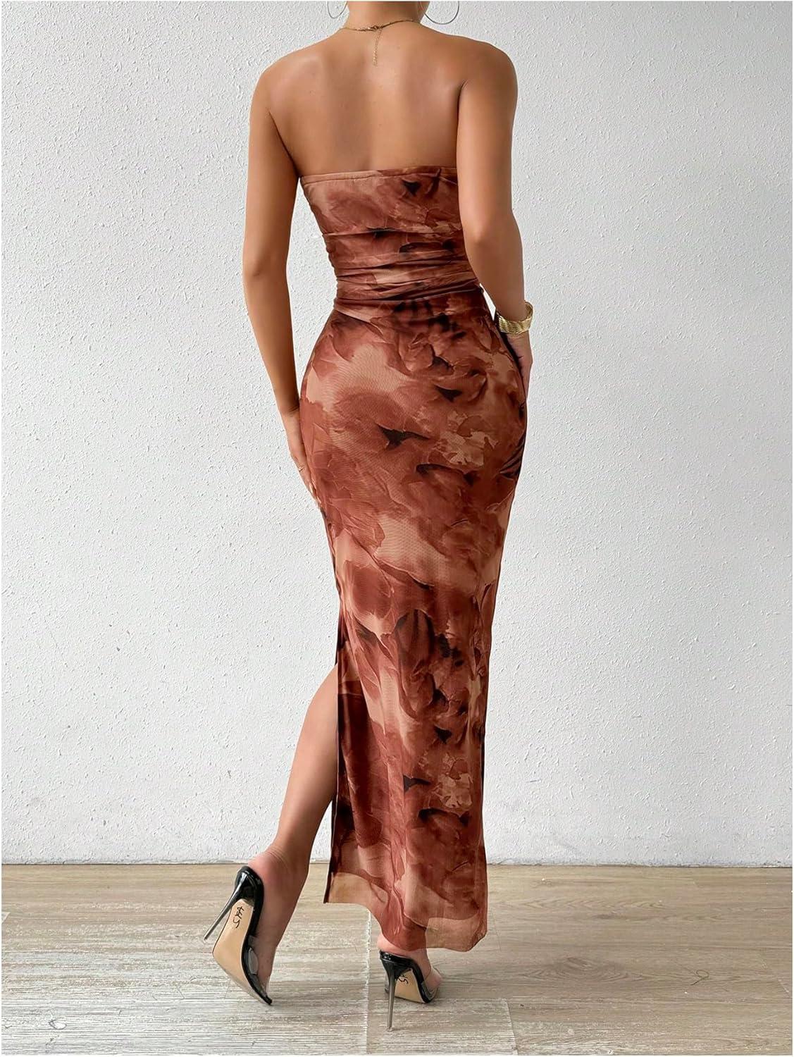 imageMilumia Womens Printed Strapless Tube Top Long Dress Slit Hem Sleeveless Bodycon Maxi DressesCoffee Brown