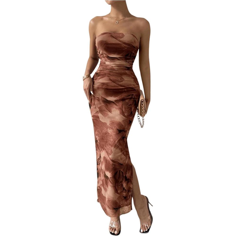 Milumia Women's Printed Strapless Tube Top Long Dress Slit Hem Sleeveless Bodycon Maxi Dresses(Coffee Brown)