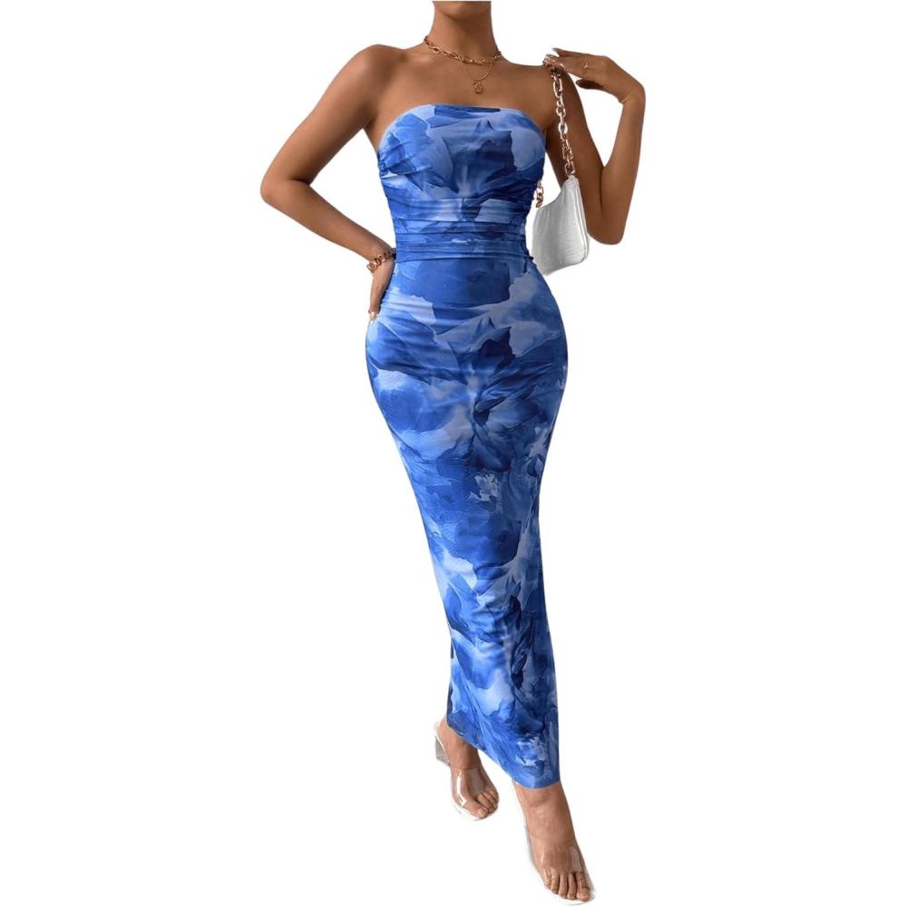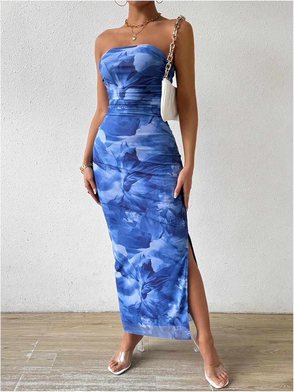 Milumia Women’s Printed Strapless Tube Top Long Dress Slit Hem Sleeveless Bodycon Maxi Dresses(Dusty Blue)
