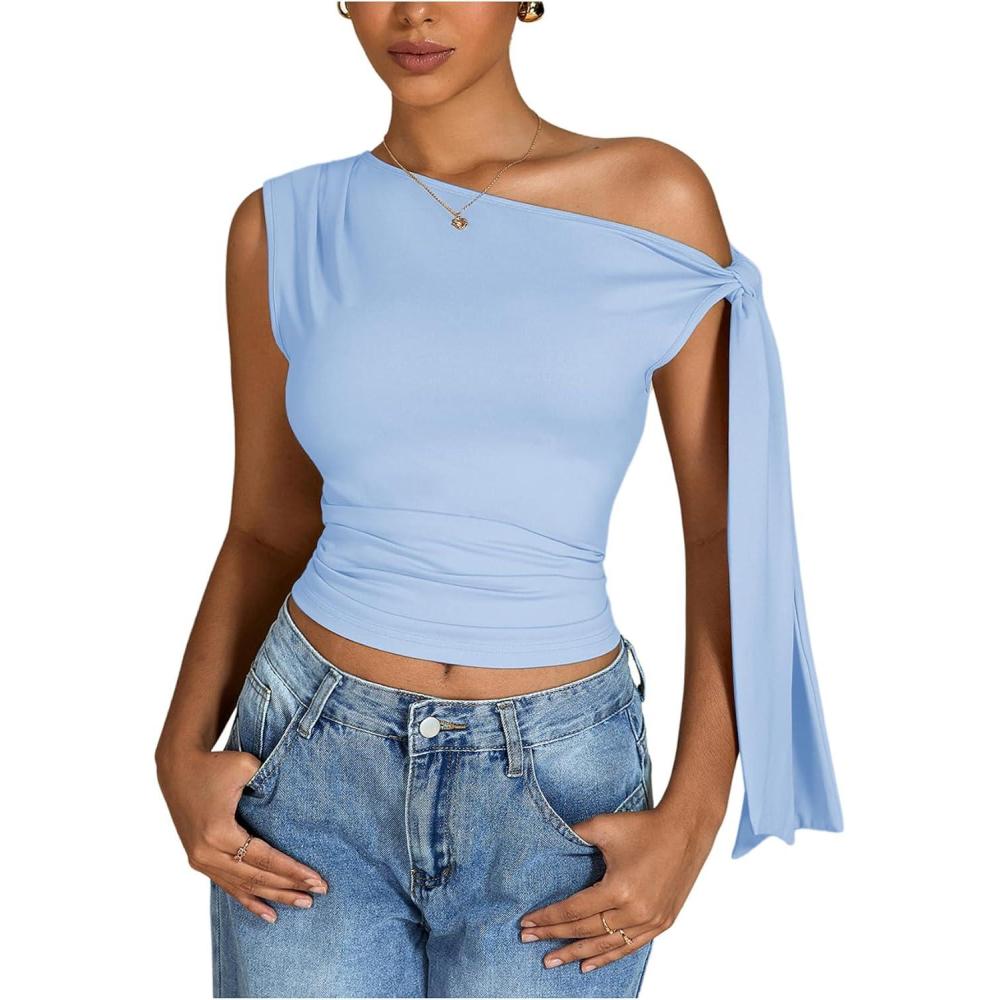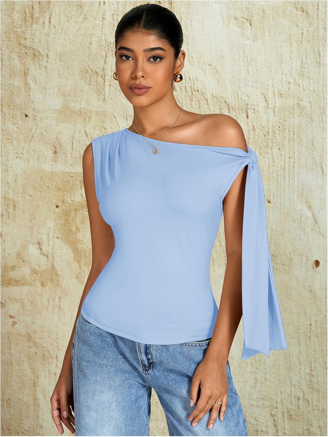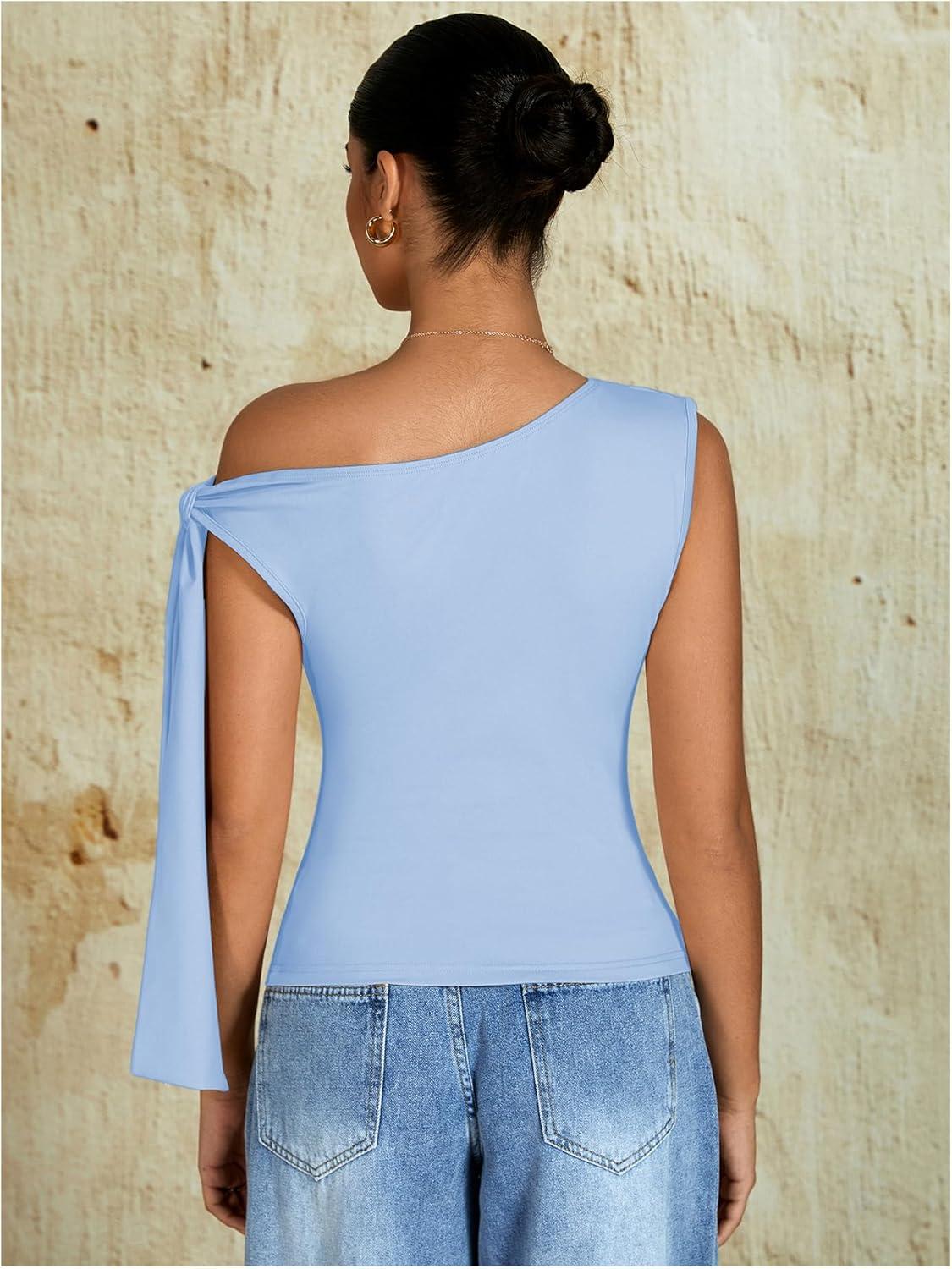Milumia Women's Ruched One Off The Shoulder Tank Tops Asymmetrical Neck Tie Shoulder Going Out Top(Blue)