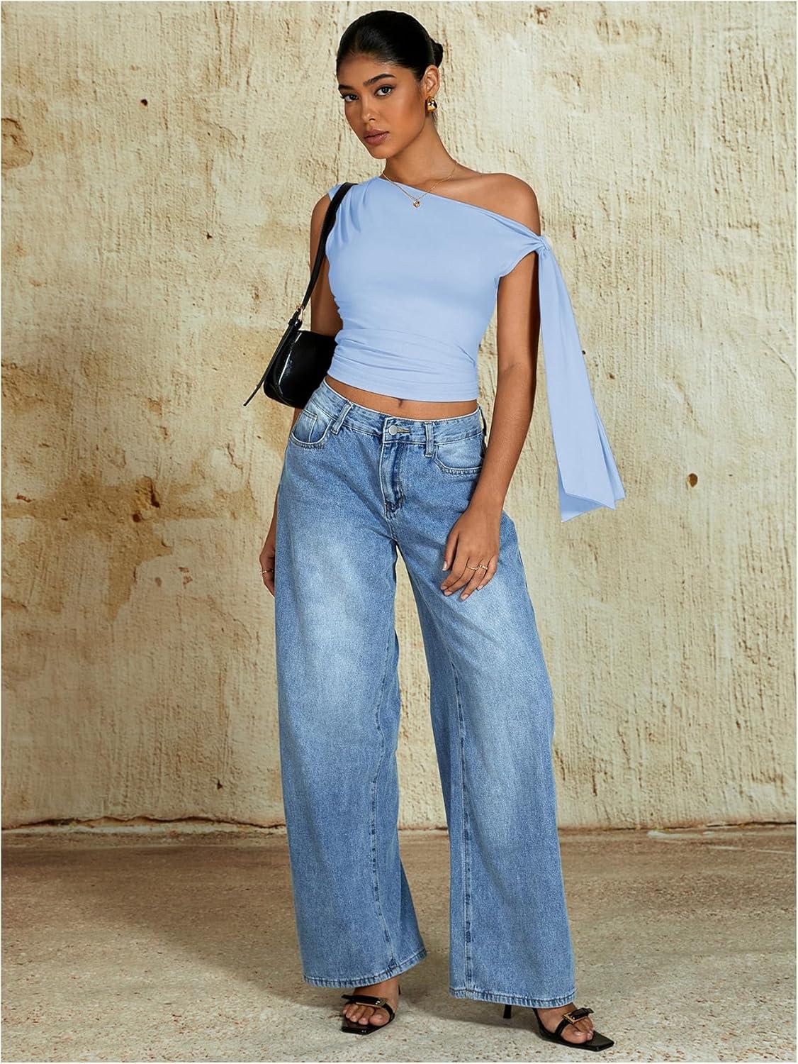 Milumia Women’s Ruched One Off The Shoulder Tank Tops Asymmetrical Neck Tie Shoulder Going Out Top(Blue)