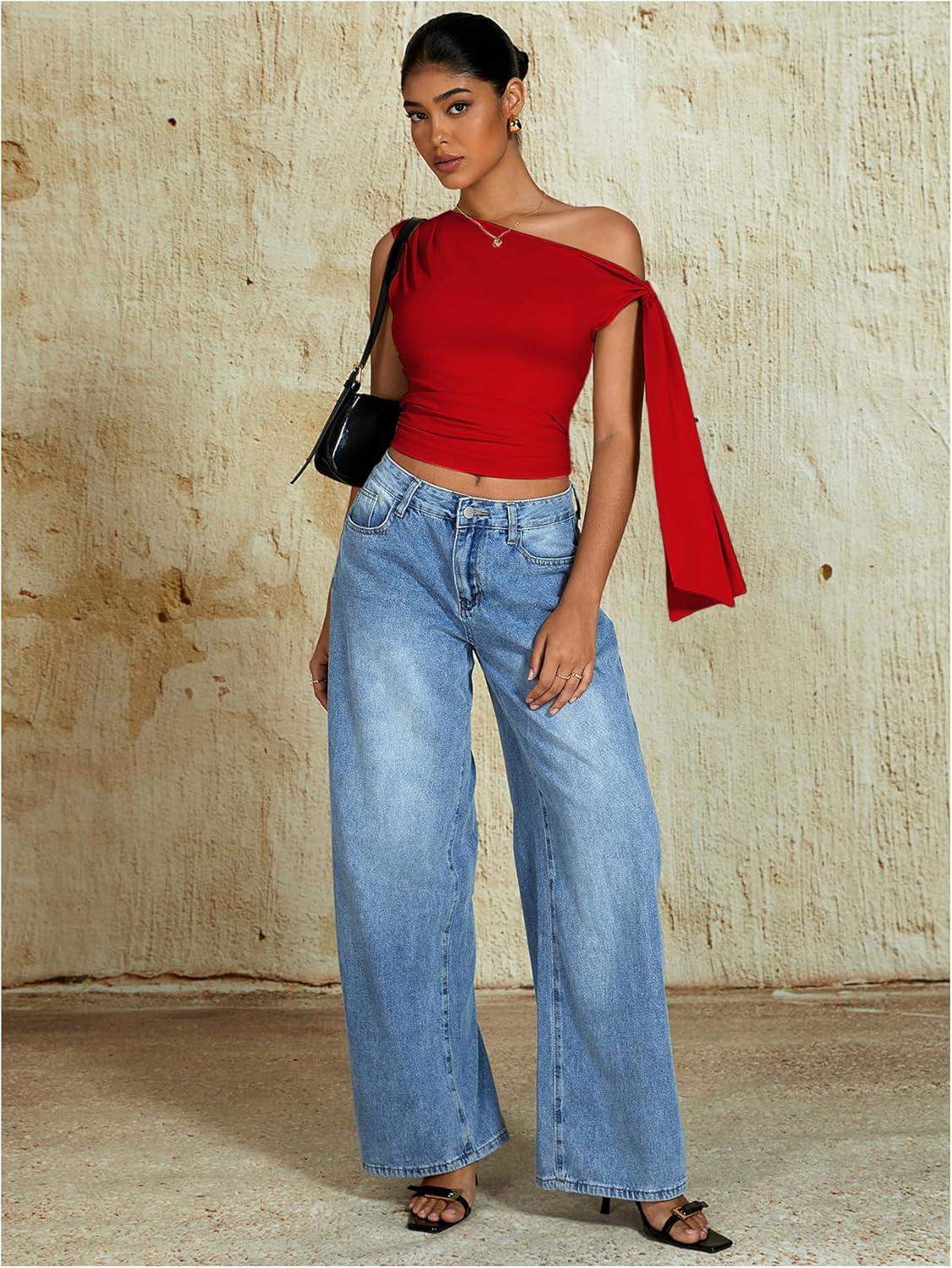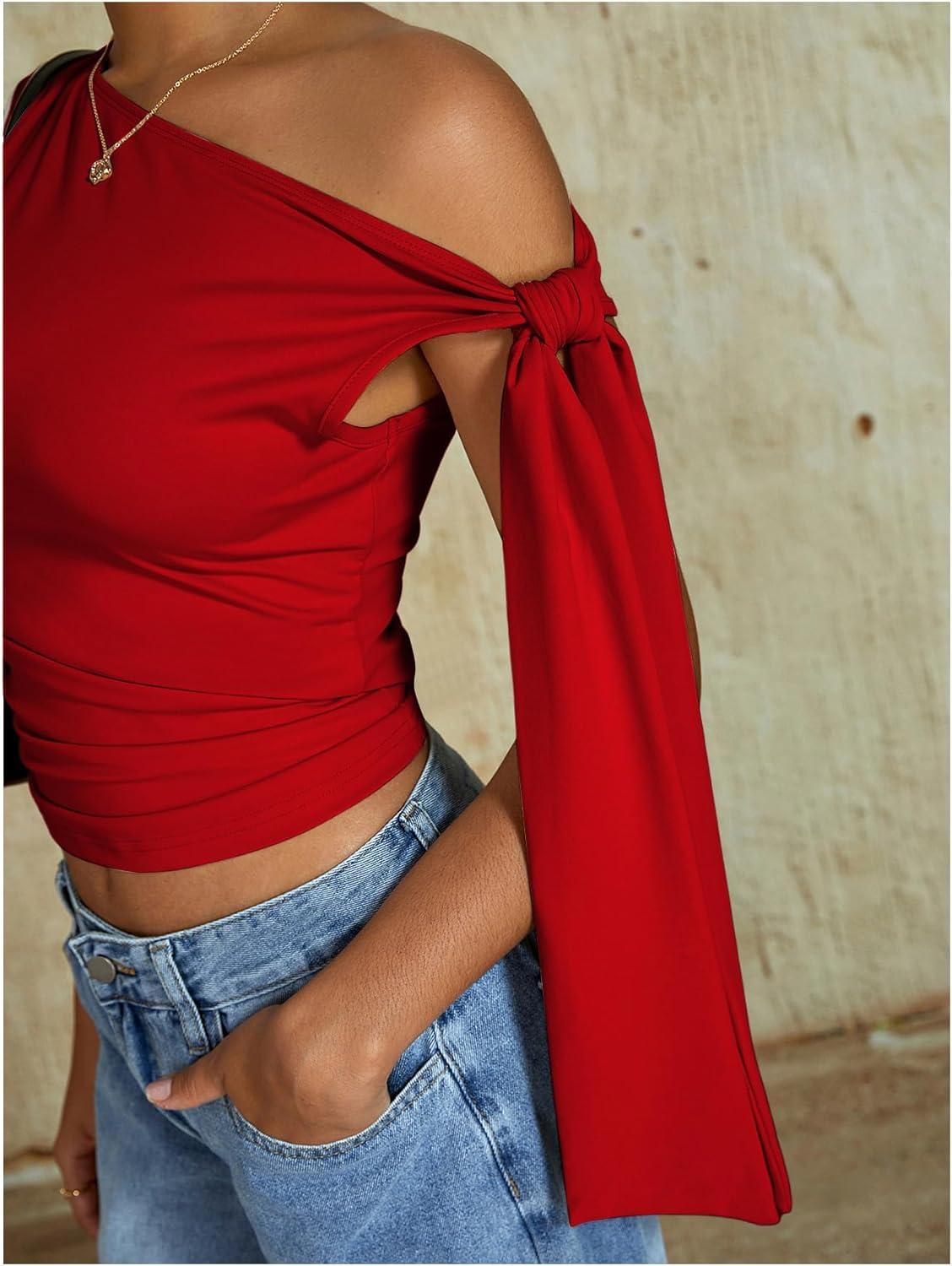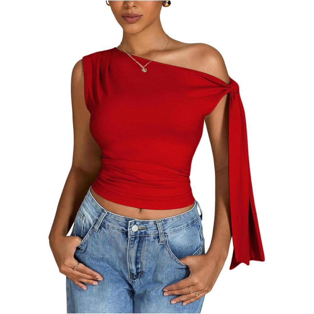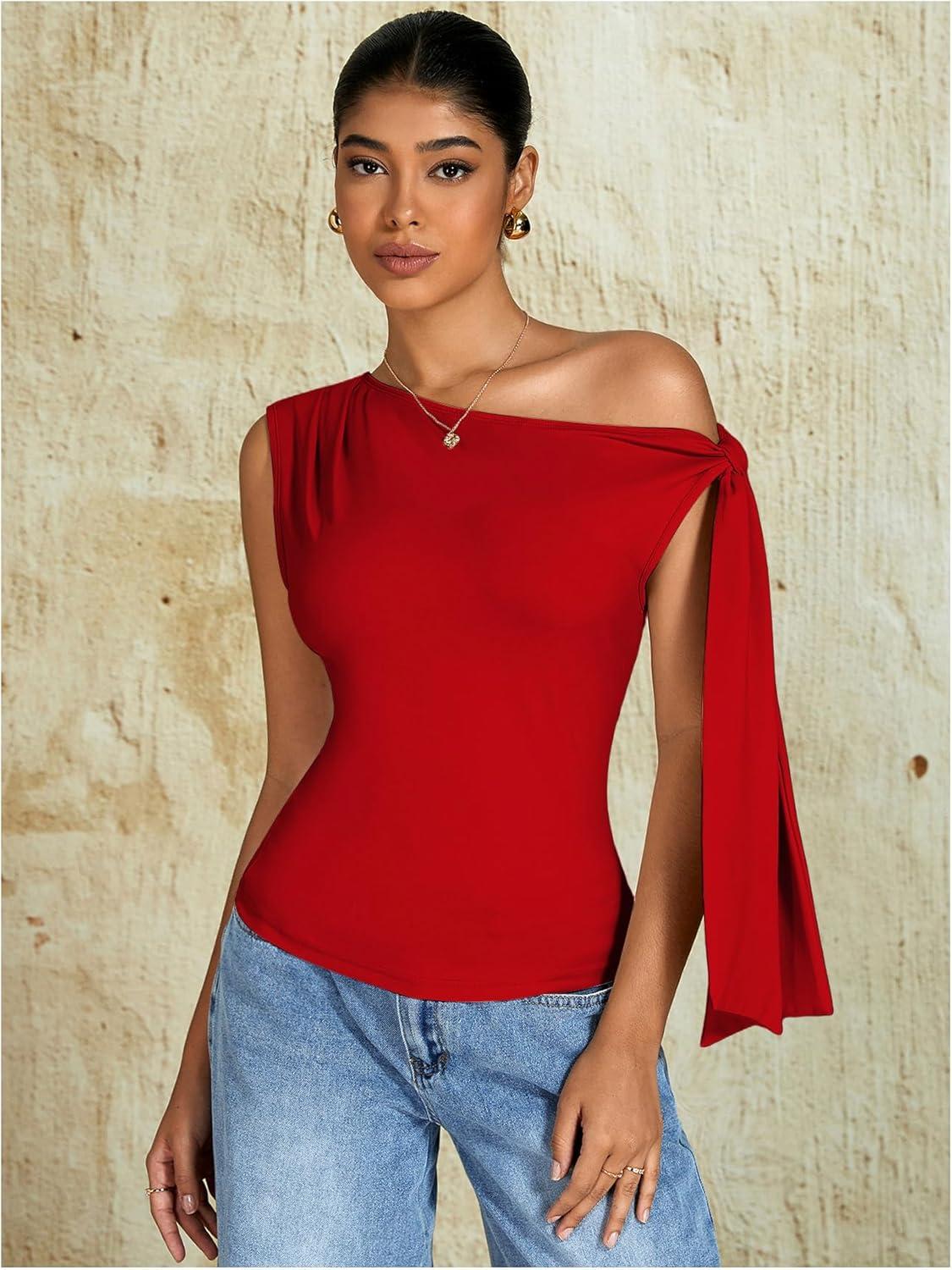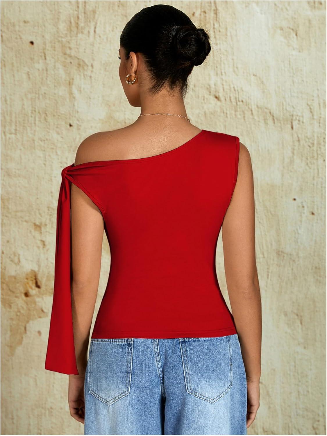 Milumia Women's Ruched One Off The Shoulder Tank Tops Asymmetrical Neck Tie Shoulder Going Out Top(Red)