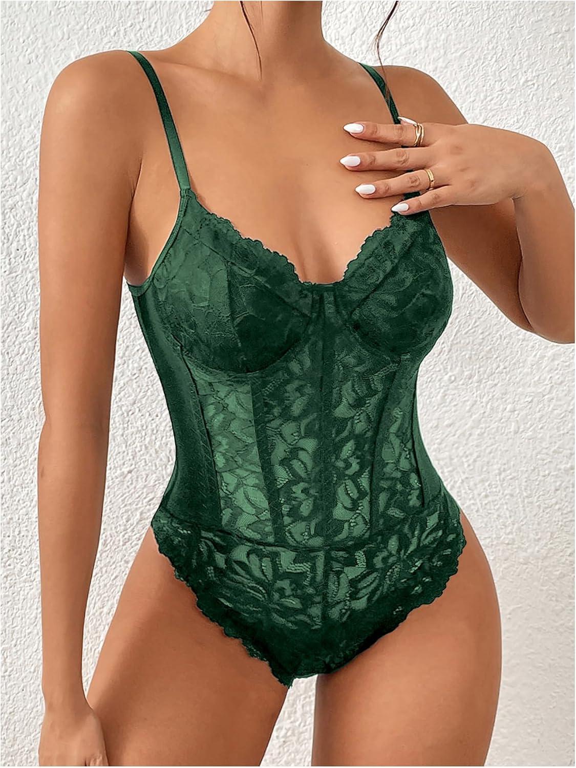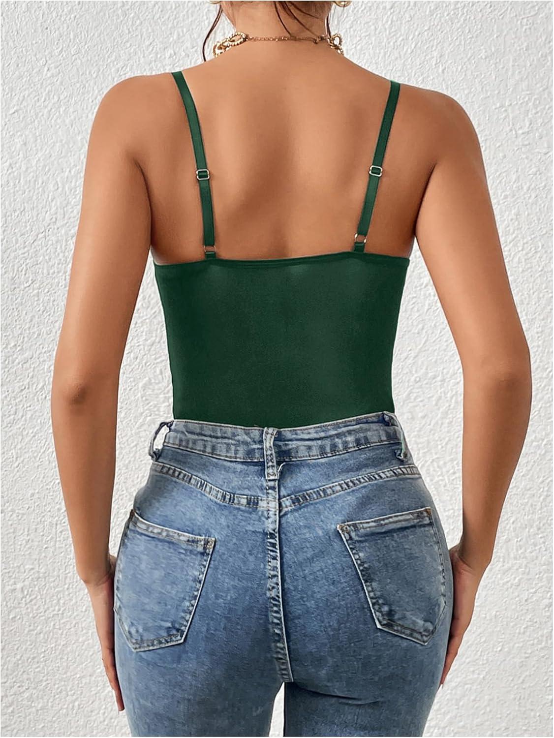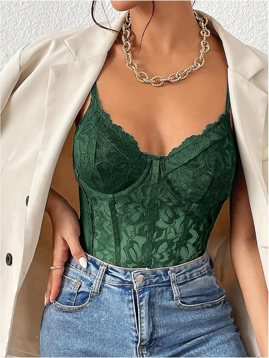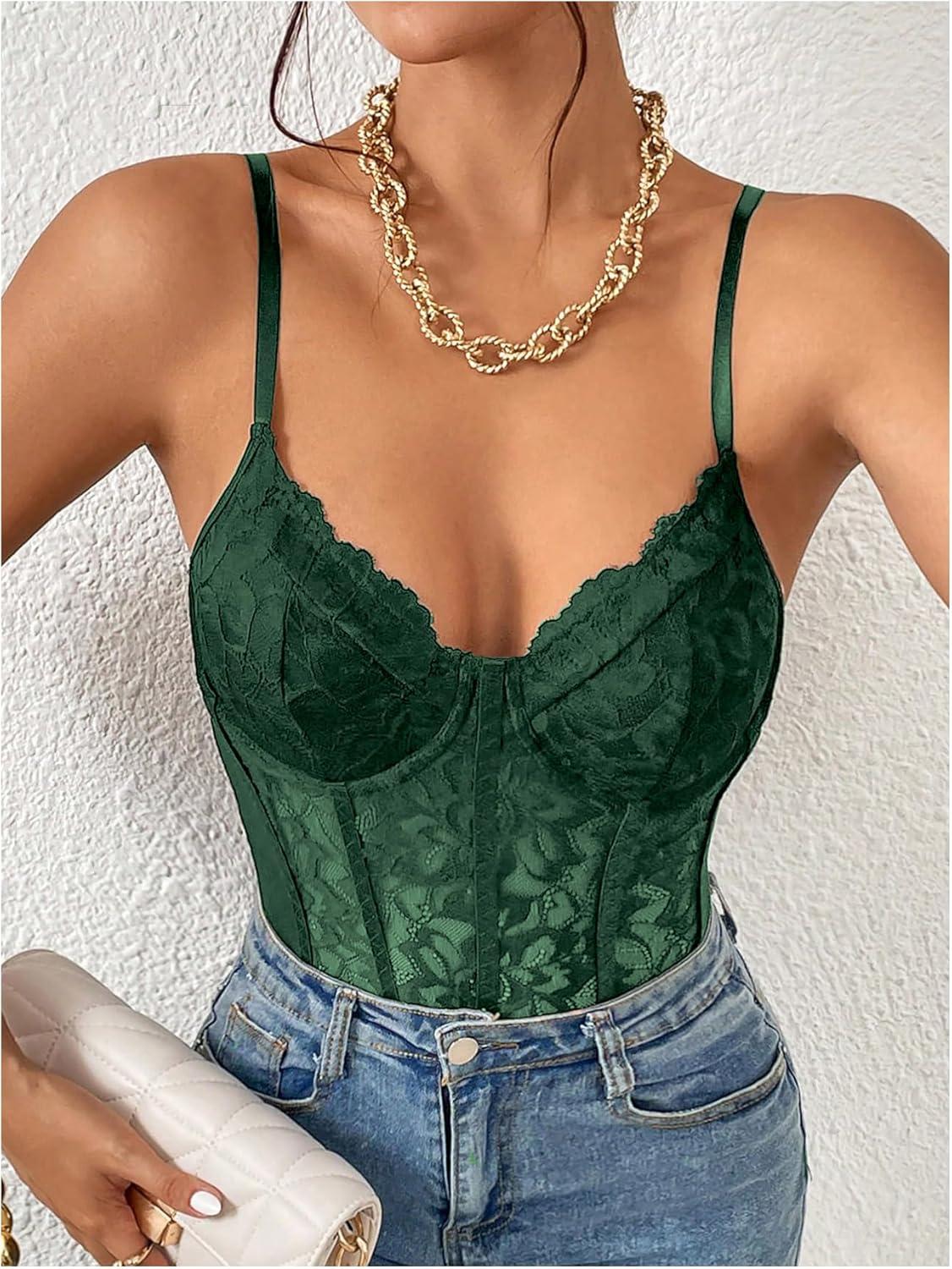 Milumia Women’s Sexy Floral Lace Sheer Mesh Corset Bodysuit Spaghetti Strap Cami Tops Going Out(Deep Green)