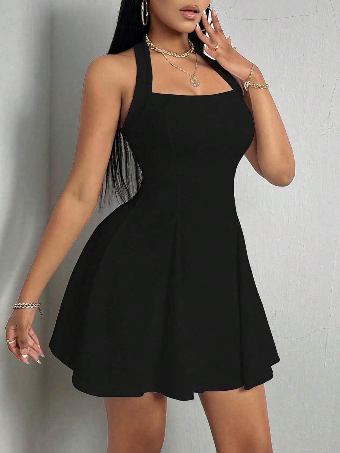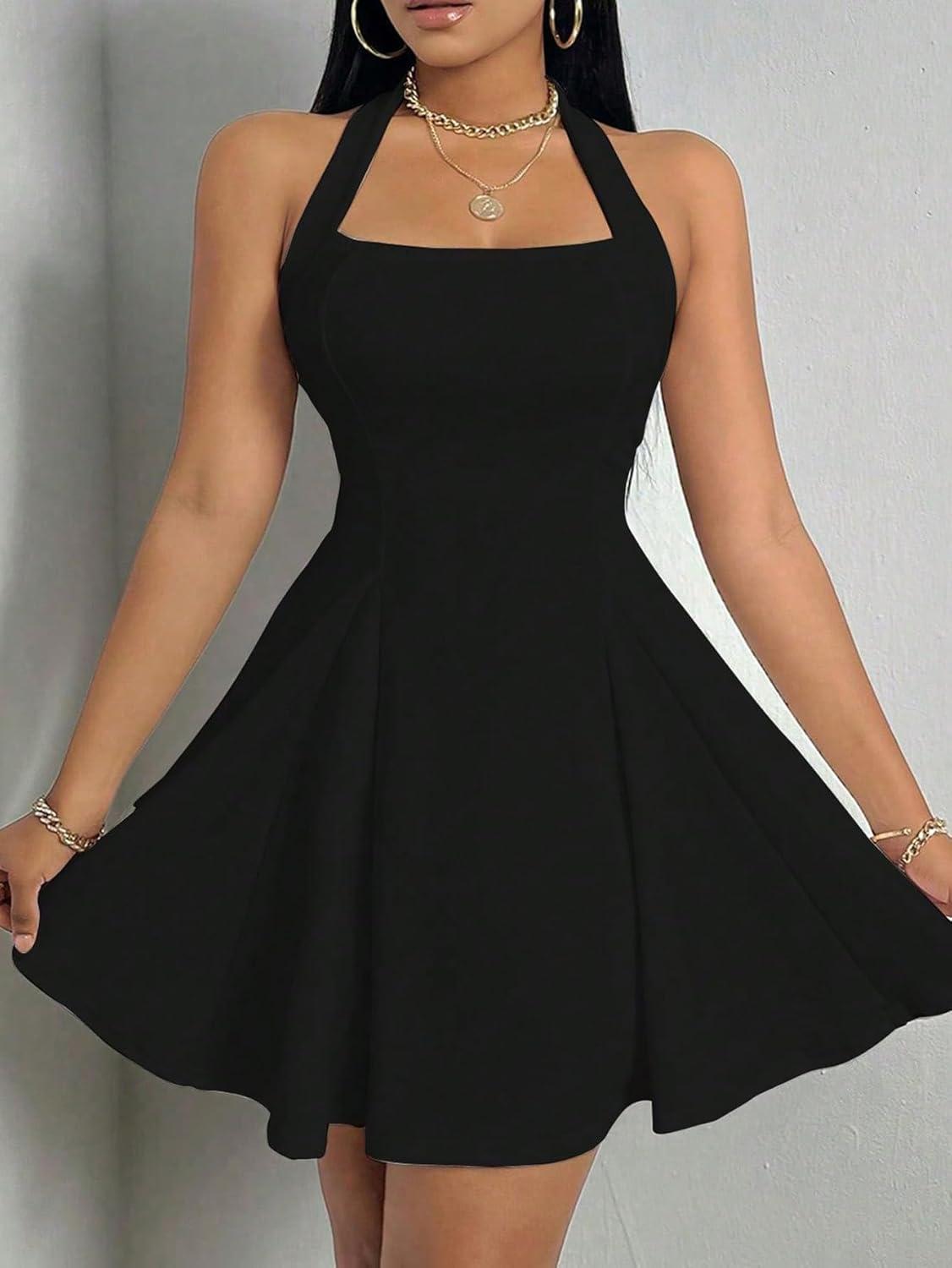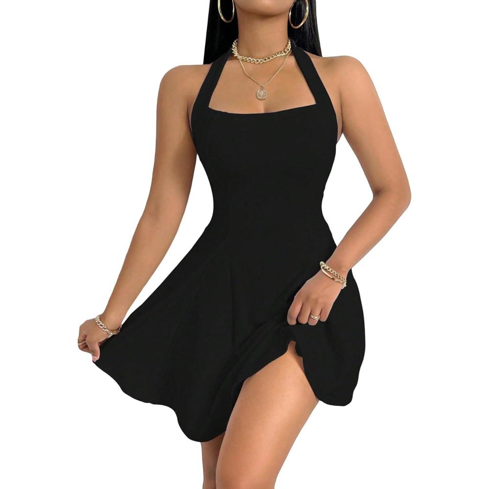 Milumia Women’s Striped Halter Mini Dress A Line Flared Sleeveless Summer Dresses(Black)