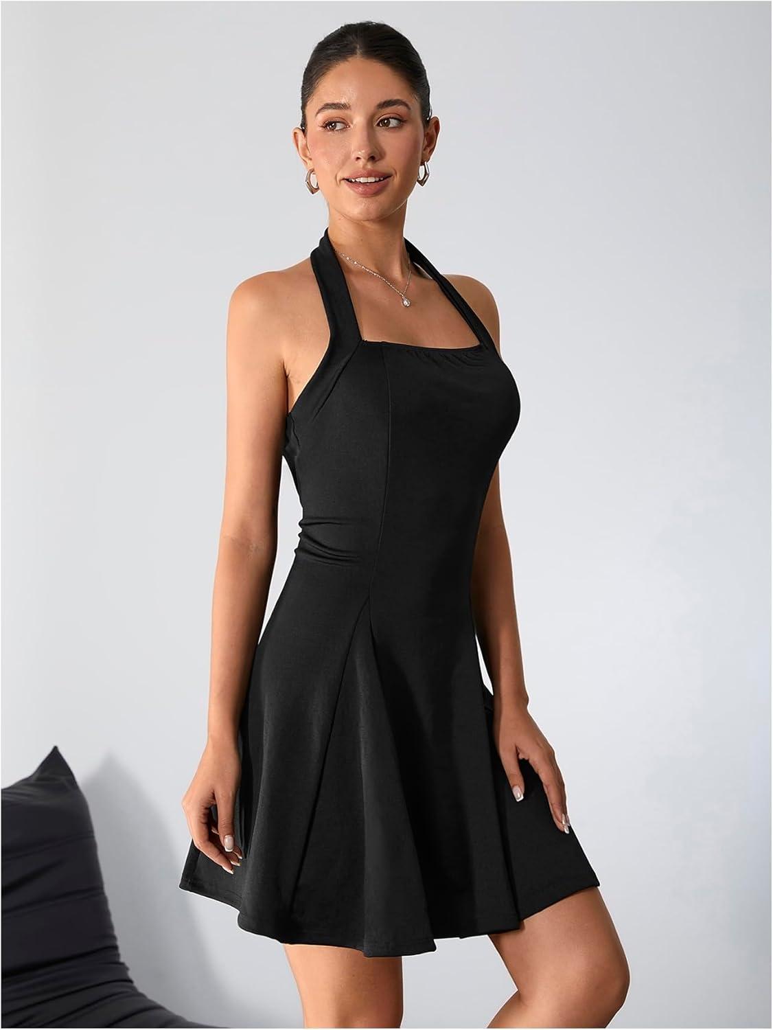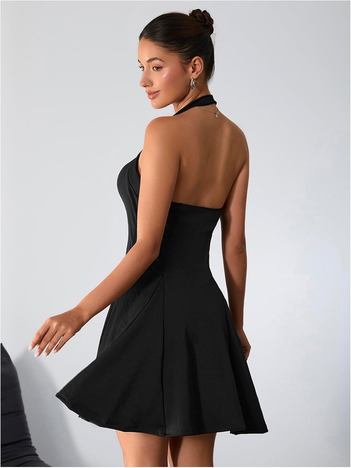 Milumia Women’s Striped Halter Mini Dress A Line Flared Sleeveless Summer Dresses(Dark Black)