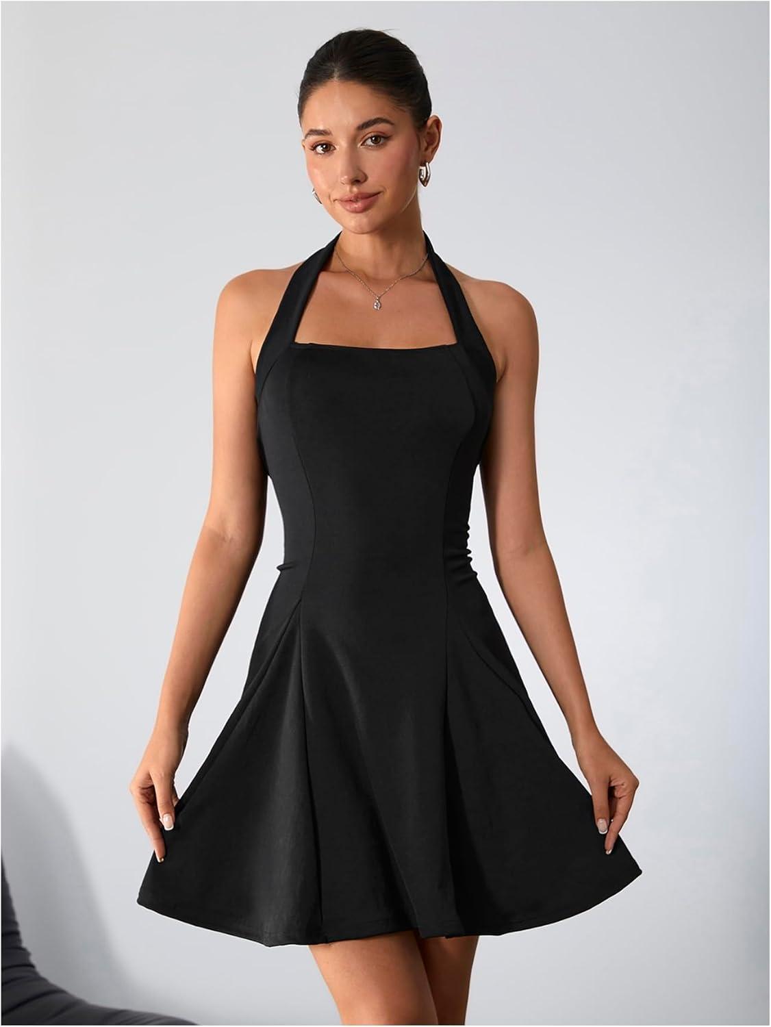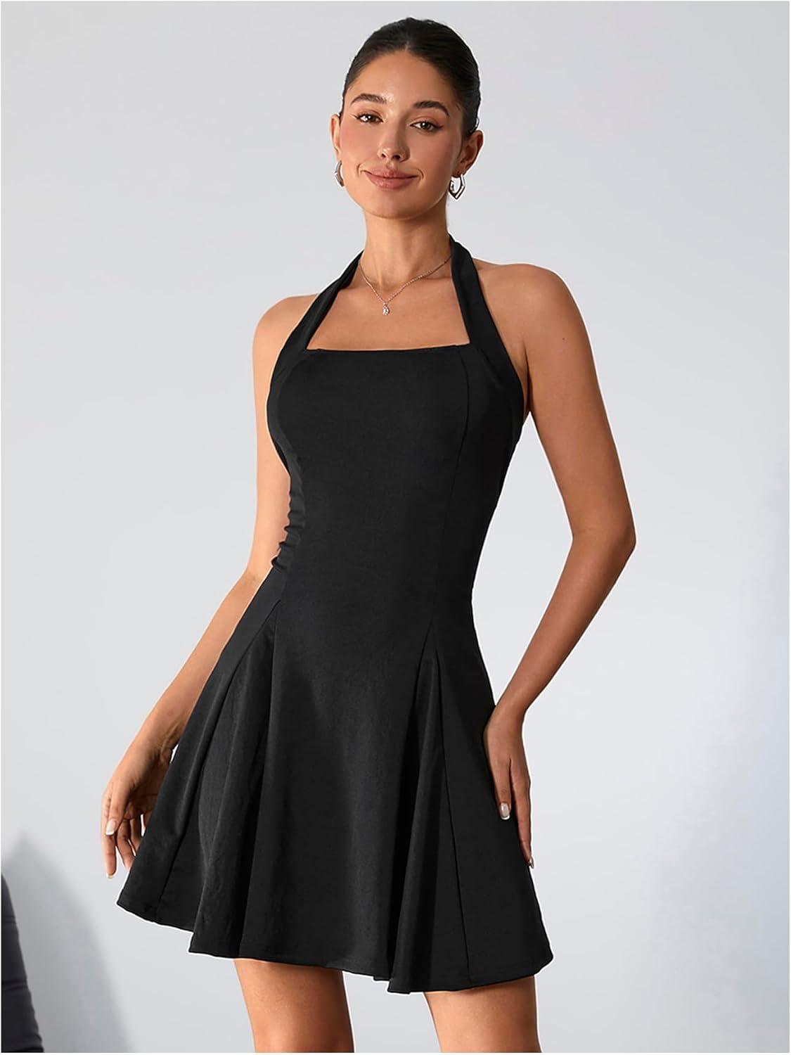 Milumia Women’s Striped Halter Mini Dress A Line Flared Sleeveless Summer Dresses(Black)