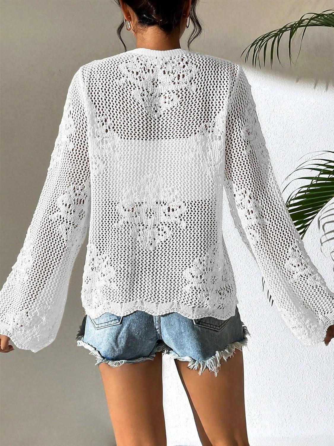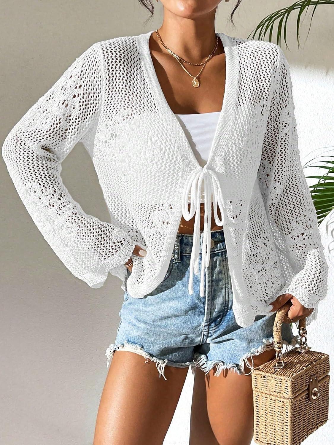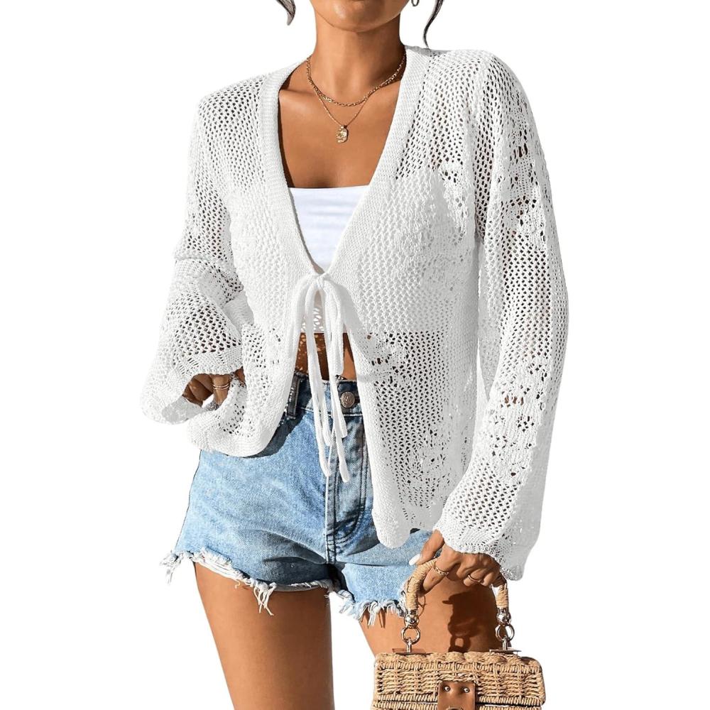 Milumia Women’s Tie Front Hollow Out Crochet Light Weight Long Sleeve Cardigans(White)