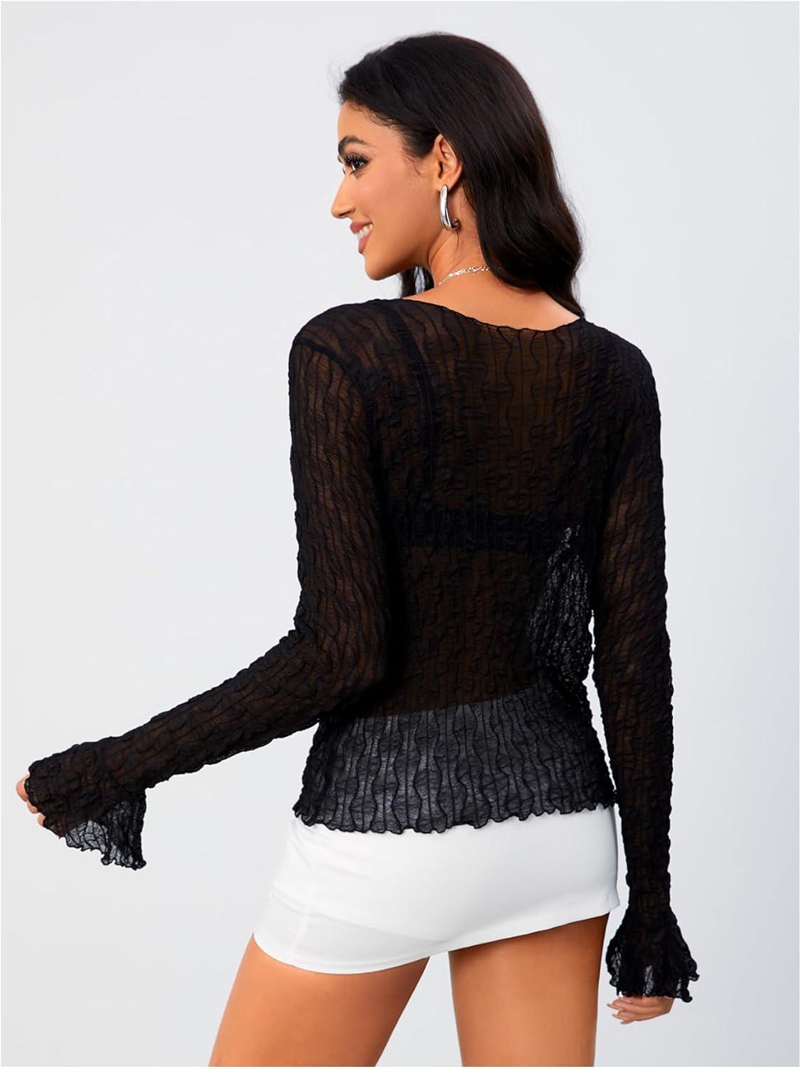 Milumia Women’s Y2K Textured Lettuce Trim Tie Front Cardigan Long Sleeve Sheer Shrug Top Cover Ups(A Black)