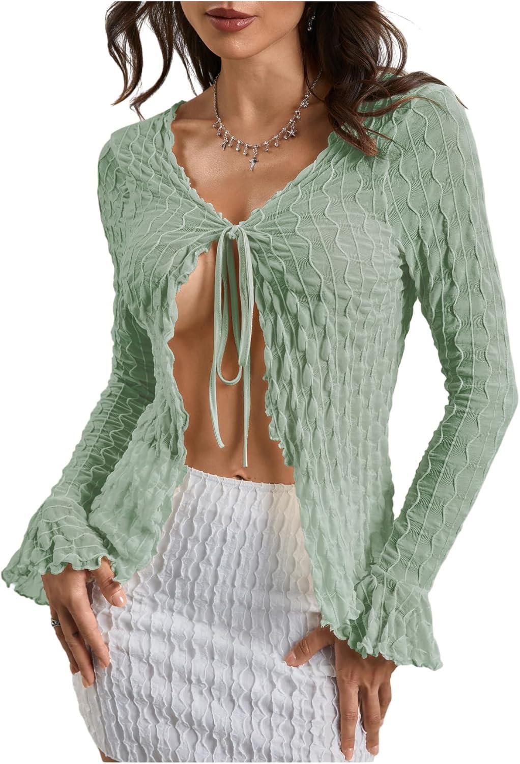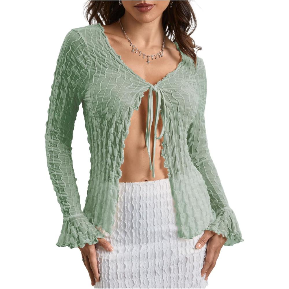 Milumia Women's Y2K Textured Lettuce Trim Tie Front Cardigan Long Sleeve Sheer Shrug Top Cover Ups(Green)